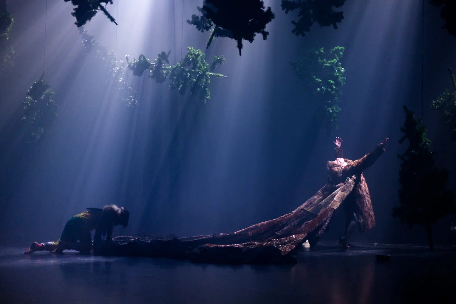 Pirjo and Pinja rehearsing the final scene with Marona and Titta observing from where the audience would be. Many elements were in place already like the fur coats, plastic Christmas trees and the birdcage. Originally, the idea was for the child to go slowly across the stage from left to right (through clay), but this changed, both performers ending up going from front to back.